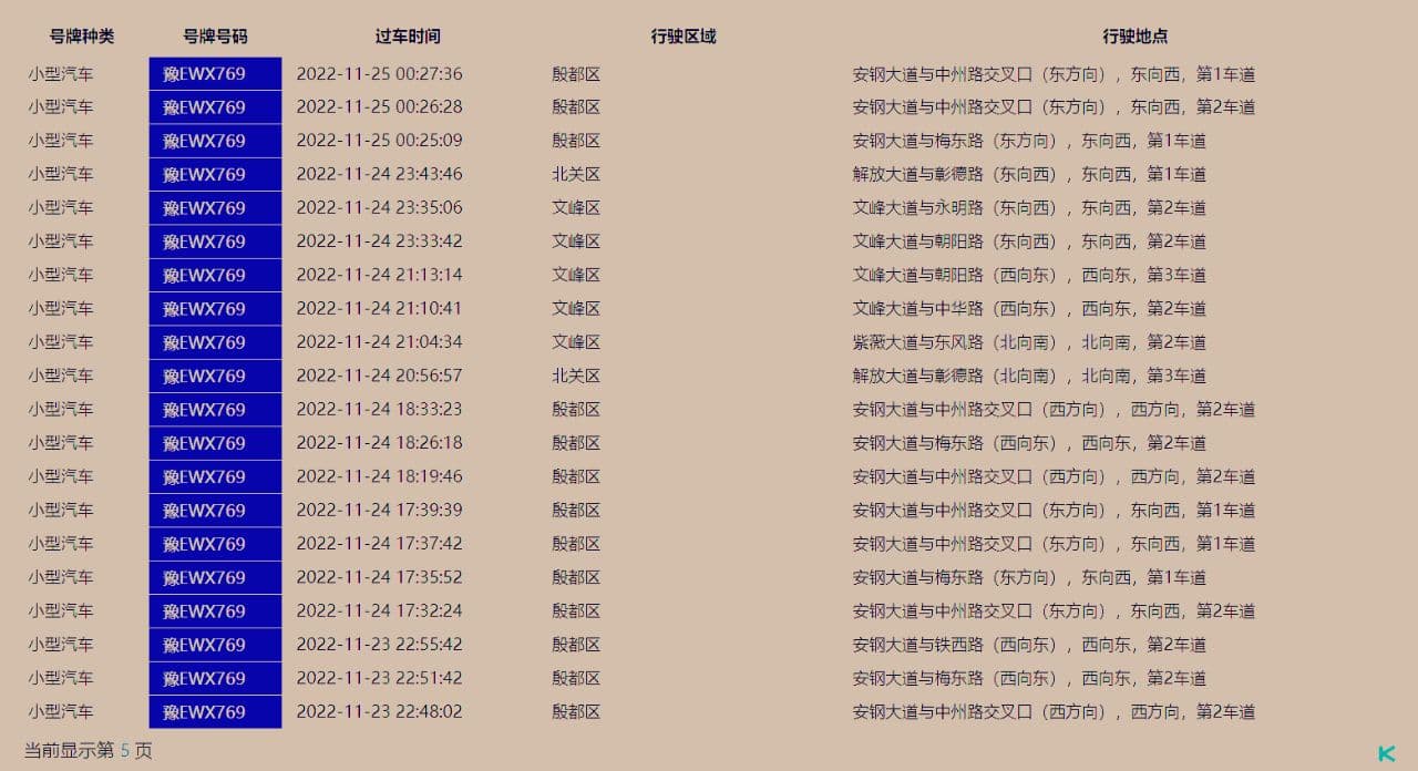 默认只出5页,这5页内容跑了什么路,取决于他平时开车的频率,比如每天都开车的话,5页内容可能仅仅是他几天的记录。如果频率不高,5页的内容可能覆盖了几个月的活动轨迹。车辆轨迹只记录在道路的行驶情况,车辆停靠地点无法直接通过车辆轨迹得出,需要你结合车主的行为逻辑,自己推断。